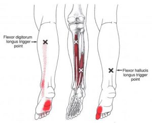 Mezi svaly, jejichž spoušťové body mohou vyvolávat bolest chodidla, patří: