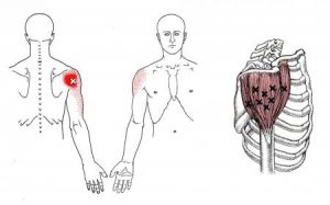 Téměř nikdy se neobjevuje samostatně, většinou v doprovodu trigger pointů v oblasti ramenních svalů. Sám o sobe způsobuje bolest na přední straně ramene a zadní straně celé horní končetiny s vynecháním lokte. Pro postiženého je bolestivé nebo nemožné dát si ruku za záda a sáhnout přes hlavu na druhé ucho.