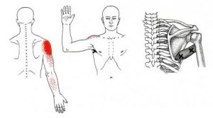 Od lopatky přes zadní stranu celé horní končetiny se rozprostírá referenční zóna spoušťového bodu. Postiženému je nepříjemné ležet na postiženém boku a objevují se u něj problémy při přenášení těžších věcí s nataženýma rukama.