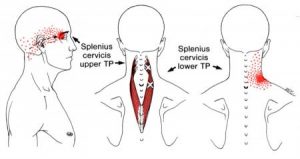 Bolest z krku, která směřuje kolem ucha za oko je typická pro spoušťový bod v horní části trapézu. Občasně se projevuje také bolestí čelisti. Obvykle se problémy nachází pouze na jedné straně, ale není výjimkou, že mohou postihnout strany obě.