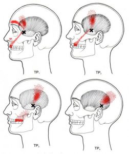 Problém v přední části tohoto žvýkacího svalu se projevuje bolestí obočí, spánku a horních řezáků. Bolest zubů často doprovází zvýšená citlivost na chlad nebo horko. Trigger point je přítomen u většiny poruch temporomandibulárního kloubu.