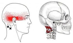 Těžko lokalizovatelná jednostranná bolest uvnitř hlavy a stejného oka naznačuje spoušťový bod v horní části svalu.
